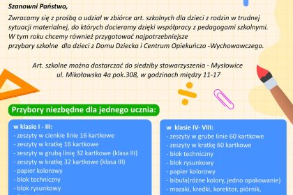 Zachęcamy do udziału w zbiórce artykułów i przyborów szkolnych dla dzieci w trudnej sytuacji materialnej oraz dzieci z Domu Dziecka i Centrum Opiekuńczo-Wychowawczego.